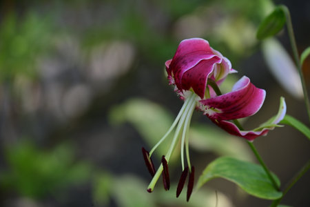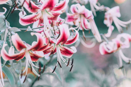 Speciosum lily flowers. Liliaceae perennial plants. Beautiful downward blooming flowers with red spots on the petals from July to September. The root is edible and medicinal.