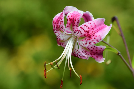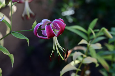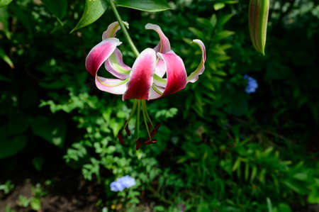 Bright pink flower Lilium Martagon with curly swirling petals, red large pistils grows on thin stem with green leaves