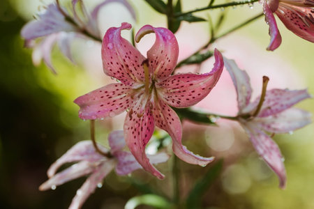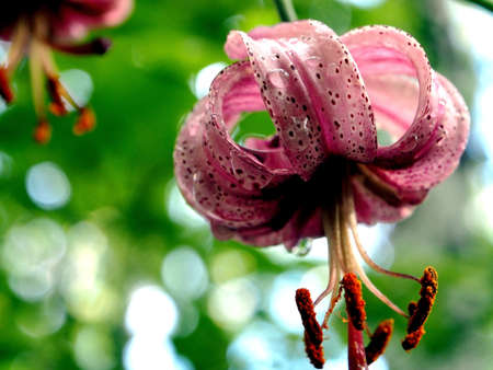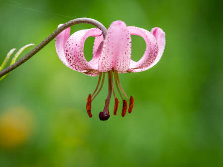 Lily martagon, a beautiful forest pink flower with morning dew drops on the petals, macro