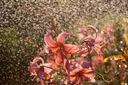 Summer photo or background with pink flowers. Beautiful natural scene with a flowering tree. Beautiful blooming lilies in a pink shade with drops.