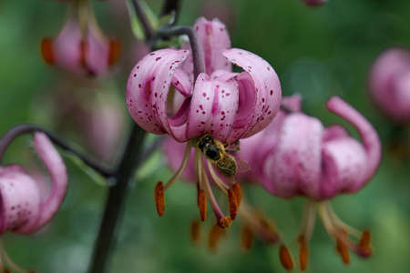 A bee collects nectar from the pink flowers of wild lilies martagon