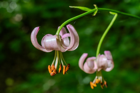Delicate Martagon lilies display elegant pink flowers with curved petals and vibrant orange stamens thriving in a green forest during the spring season.