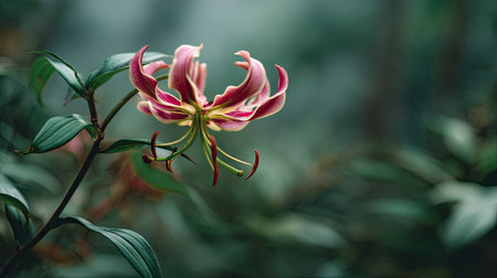 A detailed photograph of a single Gloriosa lily, swaying gently in the wind, captured in natural daylight. Fresh and airy atmosphere, soft motion blur on leaves, crisp details on textures, background softly blurred into natural greenery, cinematic natural light, realistic photography style.
