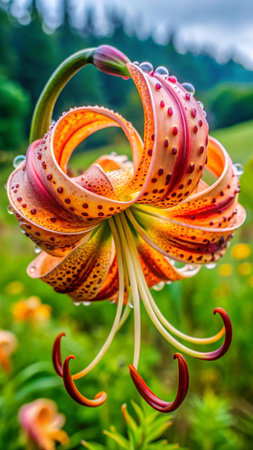 Martagon lily displays its distinctive twisting petals and rich coloration in a vibrant green forest setting under natural light during the warm summer months.
