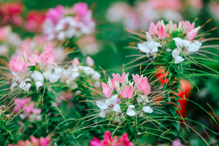 Light pink mix white spider flower / Rose queen flower is blooming in the garden under soft sunlight