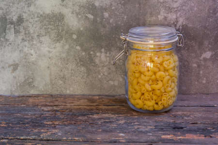 Macaroni in a glass jar placed on the old wood table on the table, selective focus