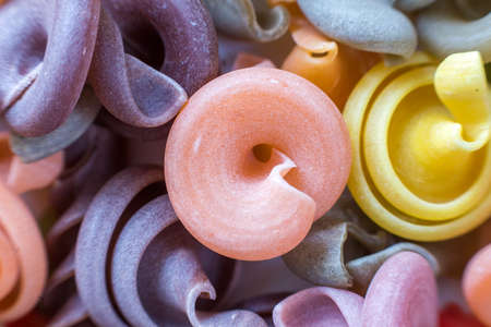 Close-up of raw dry uncooked colorful noodles pasta abstract background. Italian traditional cuisine popular ingredient, nutrition, healthy tasty diet concept.
