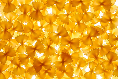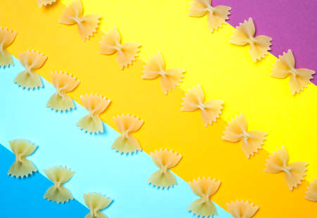 Close up pattern of noodles farfalle also known as bow-tie or butterfly pasta placed on colorful background.