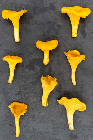 Raw chanterelle mushrooms on a black kitchen Board. flat lay, top view