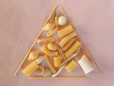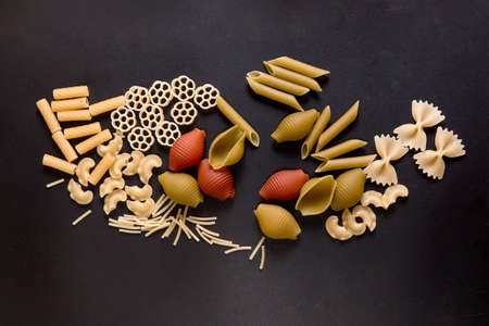 Abstract colorful pasta. Different type of pasta. Top view shot.
