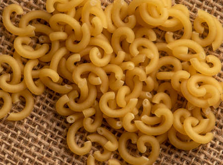 Small pasta close-up on the burlap. Carbohydrate food.