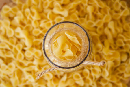 Pasta in a jar, a lot of pasta is scattered around, a jar stands on a wooden stand. High quality photo
