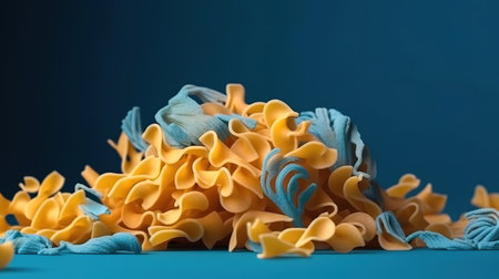 Ball of dry tagliatelle noodles on a blue background. Minimalistic food shot