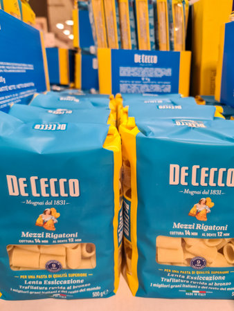 Kiel, Germany - 13. December 2025: De Cecco Mezzi Rigatoni pasta packages displaying on a blue and yellow store shelf