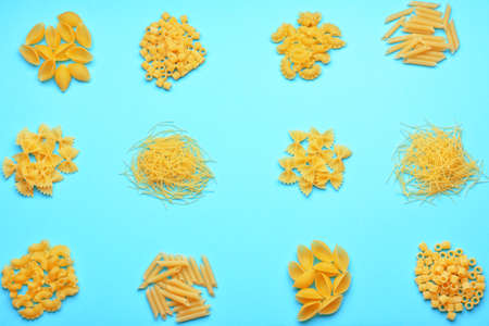 Different types of uncooked pasta, blue background. Healthy and vegan food. Top view.