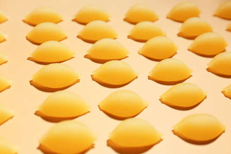 Pasta in the form of shells laid out a dense background. The picture is taken in close-up with natural lighting.