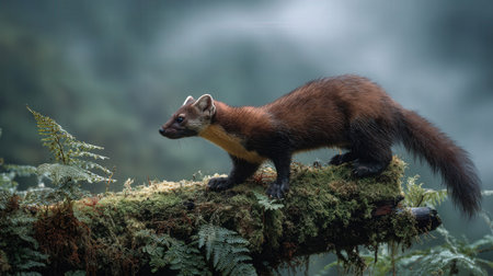 A yellow-throated marten stands alert on a moss-covered fallen log in a misty forest. This image highlights the predator in its natural, damp woodland habitat.