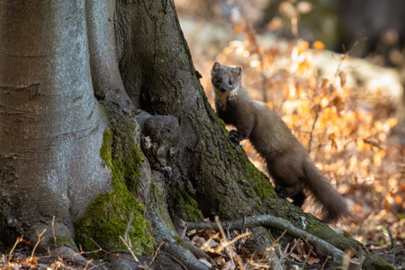Pine marten, martes martes, climbing on tree in sunny autumn nature. Fluffy mammal looking to the camera in forest in fall. Brown beast standing upright in woodland.