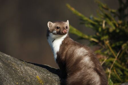 European pine marten sittin on a rock enjoying sunshine, wild forest mamal, animal wildlife lovers
