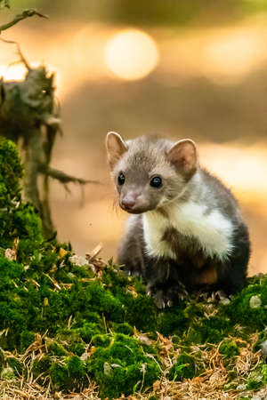 Stone marten (Martes foina) with green natural background. Detail portrait of forest animal. Small predator sitting on the beautiful green mossy tree trunk in the forest. Netherlands. Wildlife scene in nature of Europe.
