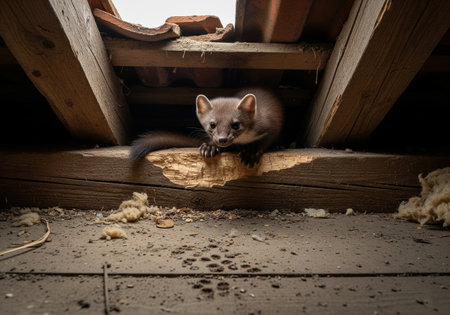 Polecates martes, in a wooden house.