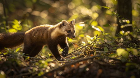 A small brown American Marten is seen walking through a dense forest, surrounded by tall trees and green foliage. The animal moves gracefully over the forest floor, its fur blending in with the natural environment.