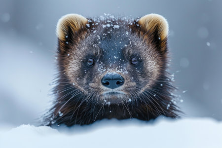 A cute animal peeking out from snow with snowflakes falling, capturing a moment of curiosity and playfulness