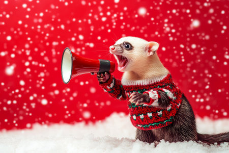 A happy ferret in a holiday sweater, holding a megaphone and spreading Christmas cheer on a red snowy background.