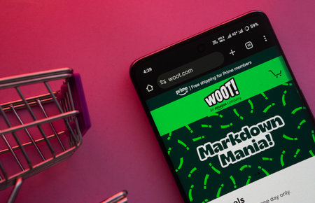 Dhaka, Bangladesh- 23 June 2025: A smartphone displaying the Woot website with a shopping cart is shown on a vibrant background.