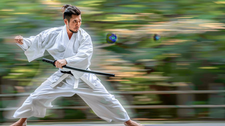 Martial Artist in Motion Skilled Swordsman Demonstrates Iaido Techniques with Blurred Background
