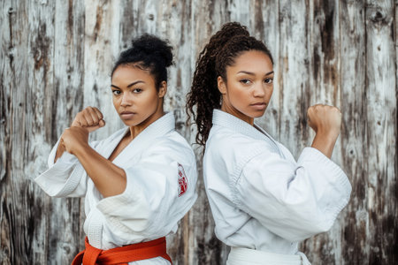 Two female karate athletes posing back to back showing fighting stance