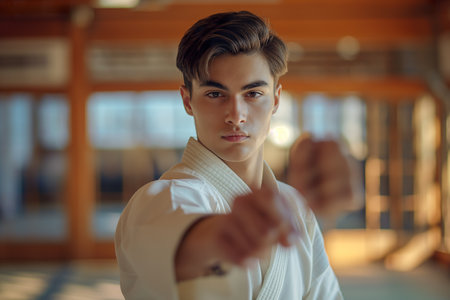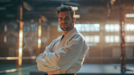 Portrait of young man in kimono looking at camera in gym