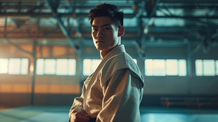 Focused judoka in training dojo for martial arts practice and competition preparation