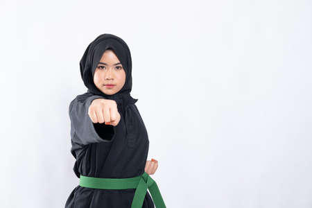 woman in hijab in pencak silat uniform poses hitting fore with copyspace