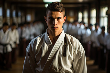 Portrait of a serious man in kimono looking at camera in martial arts school