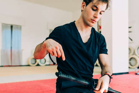 Martial artist in gym preparing sword
