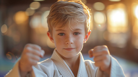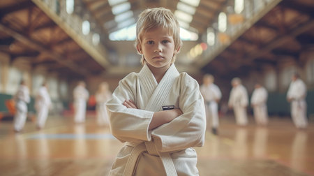 Happy european boy at judo or karate training lesson with copy space for text placement