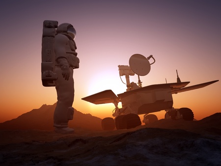 Astronaut and Mars rover in the desert. 3d rendering