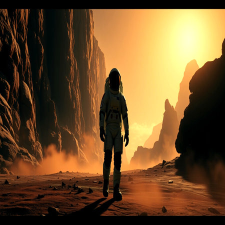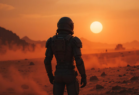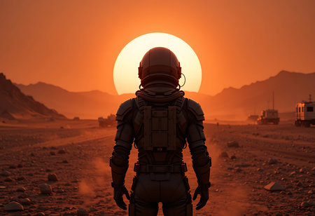 Astronaut in outer space against the backdrop of the planet Mars