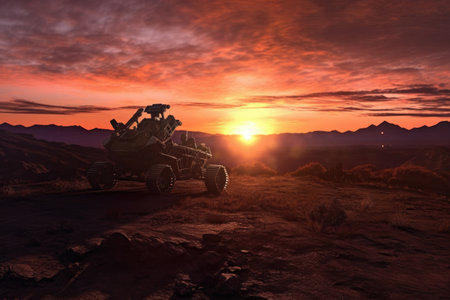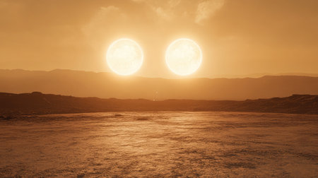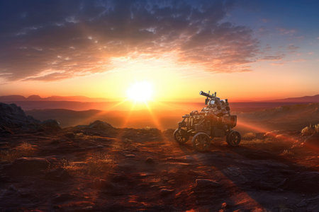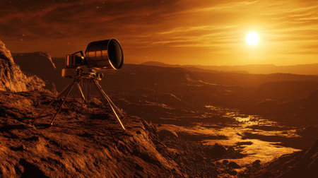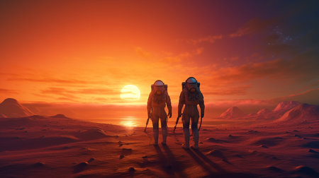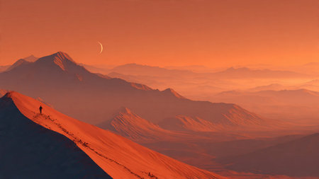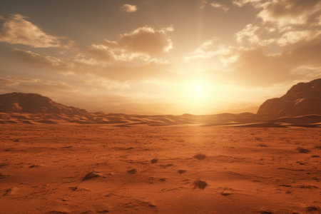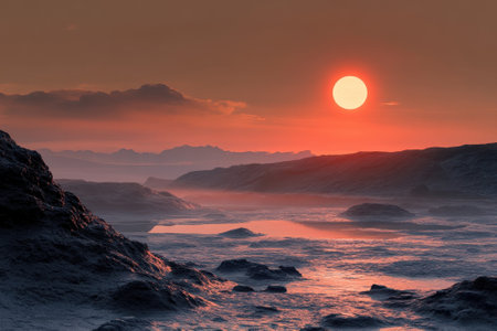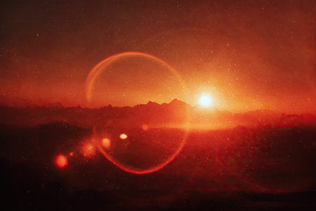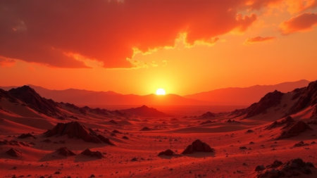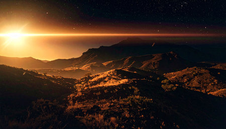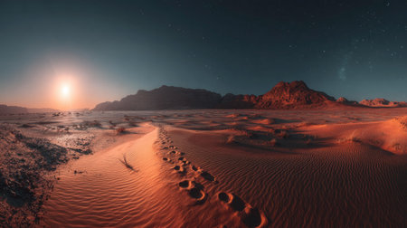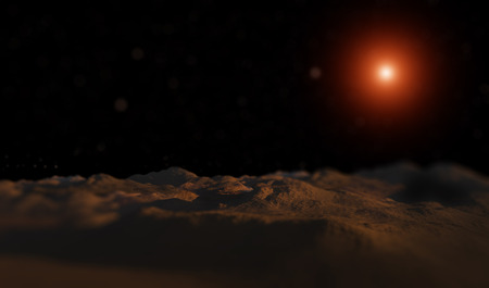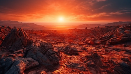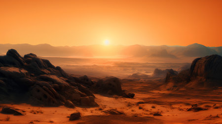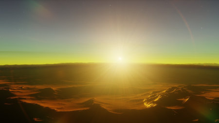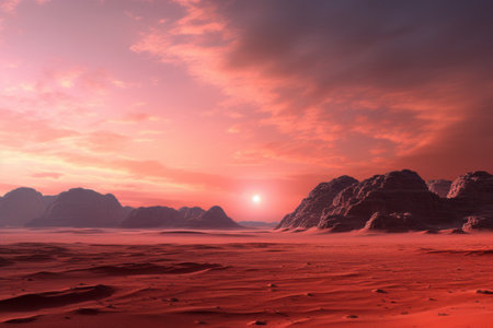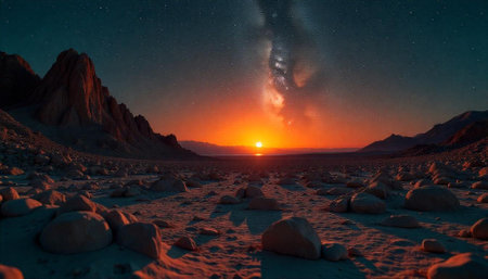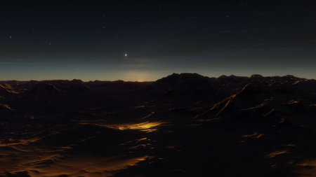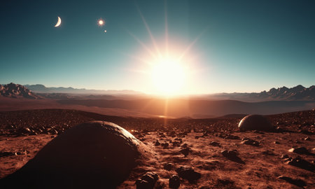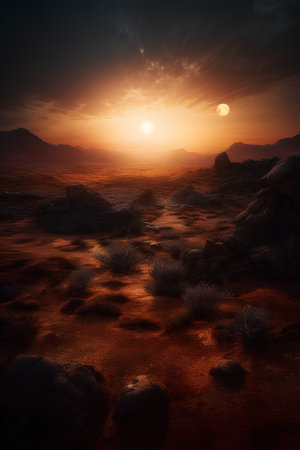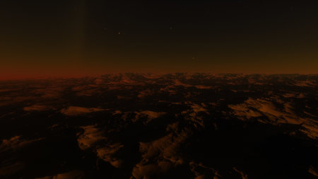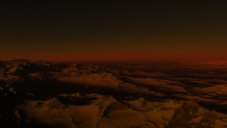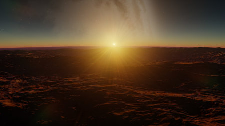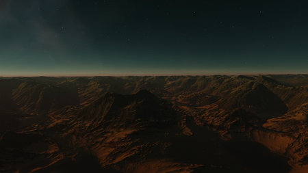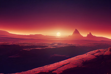 Sunset over Martian landscape with starry sky and mountains