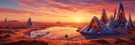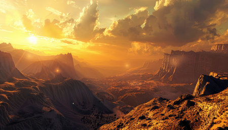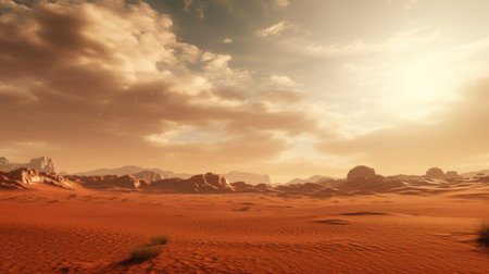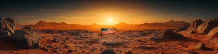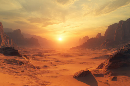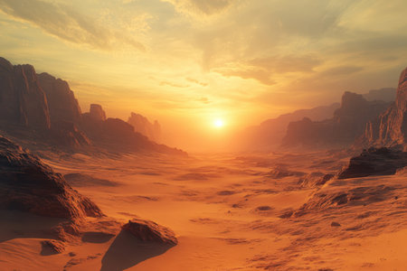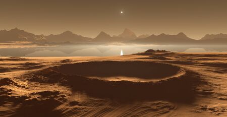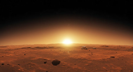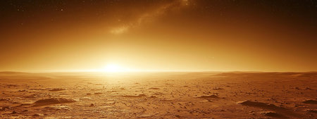 Panorama of Mars at sunset, sunrise above the surface of Mars, Martian landscape. Fantasy cosmic landscape. The surface of the red planet. 3d rendering