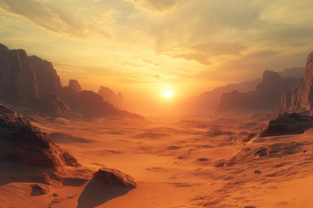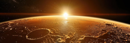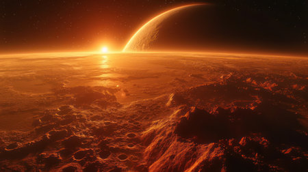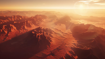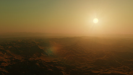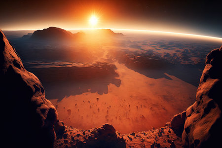 Wide view of red planet mars with mountains and sun from space during sunset or sunrise with copy space, science or space exploration background, 3D illustration