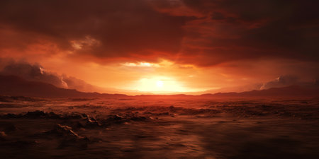 Epic barren wasteland landscape, shimmering red sun through dark clouds