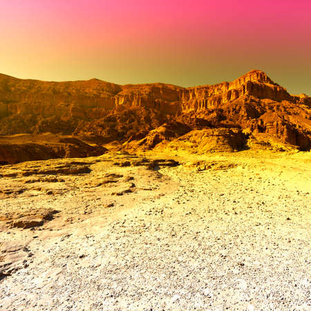 Breathtaking landscape of the rock formations in the Israel desert at dawn in a contemporary style. Lifeless and desolate scene as a concept of loneliness, hopelessness and depression.