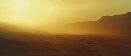Red rocky desert landscape in the mist at sunset. Panoramic shot.