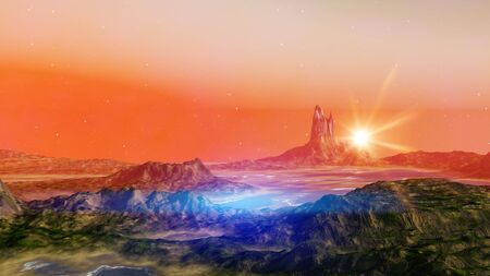 Fantasy alien planet. Mountain and sunset. 3D illustration.