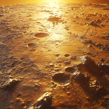 A vast, desolate terrain stretches out under a soft orange sky as the sun sets, casting long shadows on rugged rock formations. The scene evokes a sense of wonder and isolation.
