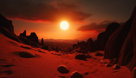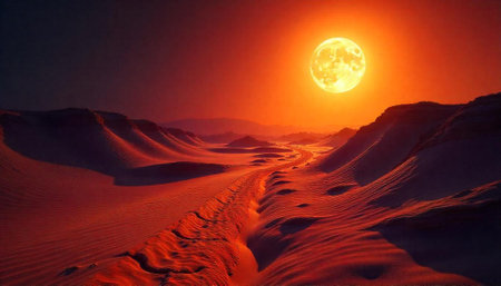 Red desert landscape with full moon rising over sand dunes