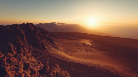 As the sun sets, warm golden hues envelop the rugged mountain landscape. Valleys and ridges blend seamlessly, creating a tranquil atmosphere that invites reflection and adventure.