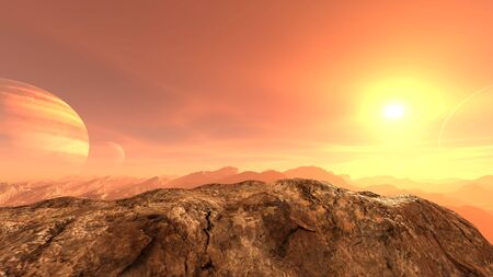 The surface of an alien planet. with orange earth, mountains, stars in the sky 3d illustration